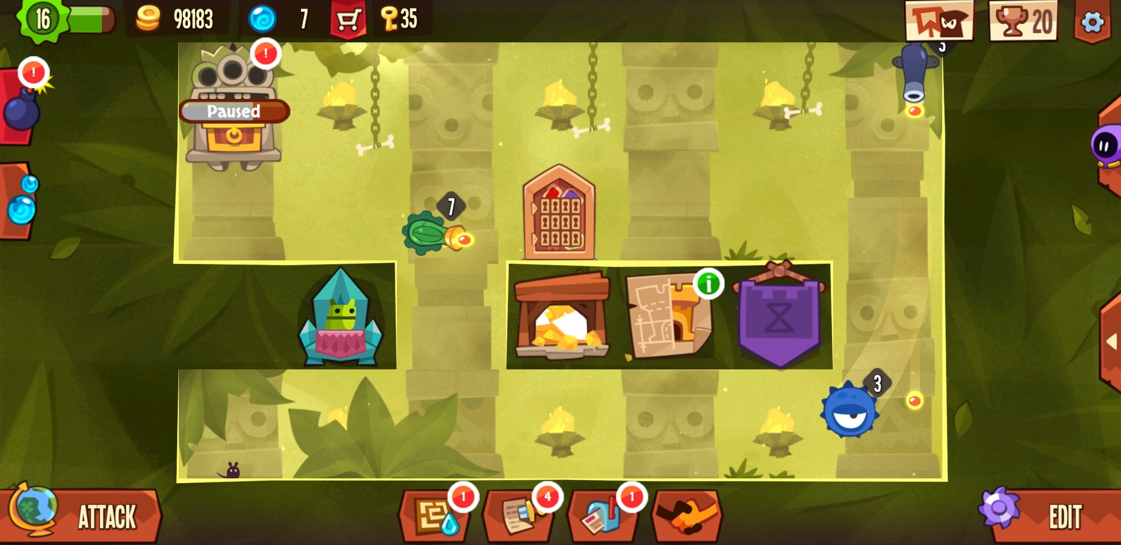 Defense is another big part of this. At the beginning of the game you’ll get a base with a similar design to those that you play through to steal a chest. Each base gets a statue with slots to put the gems you stole into and over time will increase the value of these gems which will be your main way of rising up the ranks. Issue is, because this process takes time, other players may break into your base and attempt to steal whatever gem you put in there, so you must set up your own traps and obstacles in the best way you see fit to make your base as difficult as possible for anyone to break into. Over time you will unlock new bases with more intricate designs to work with as well as better traps to stop any intruders.