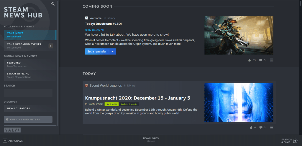 Previously an experimental feature on Steam Labs, the new Steam News Hub is now openly available. Not only will this give you news on future updates, events, and downtimes to the games you have installed, but you can follow reputable news sources to have their articles automatically come up on your Steam feed. On top of this Steam will also be hosting their very own blog. You can customize your settings for what kinds of news sources and/or news types you want to or don’t want to see.